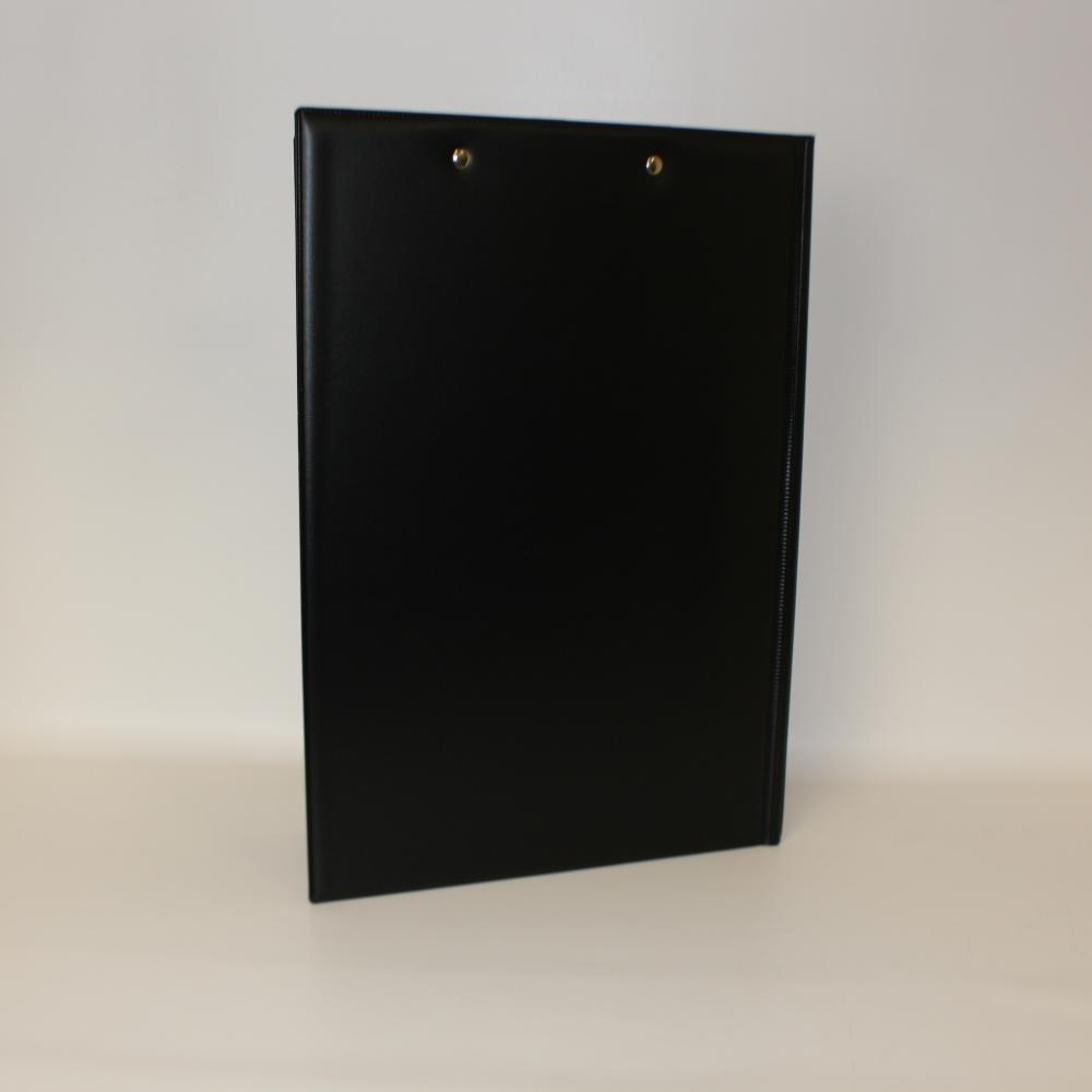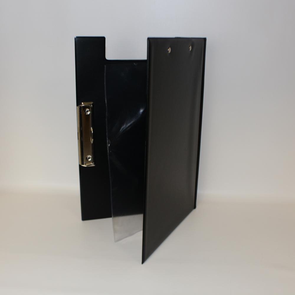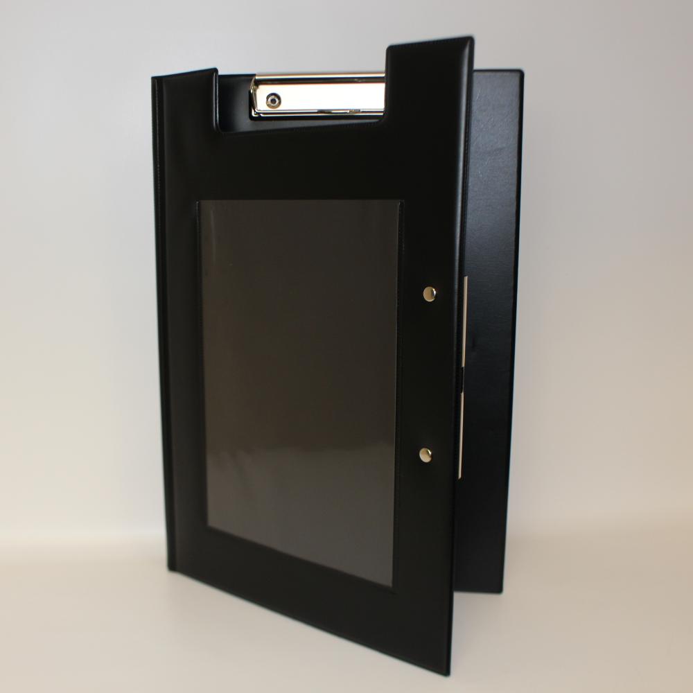 ▫ ein transparentes A5-Fach auf dem Vorderdeckel aufgeschweißt, oben offen